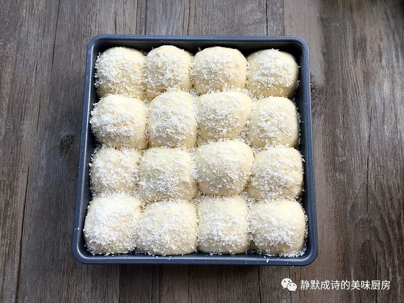 7、表面刷牛奶,撒上椰蓉。放入预热好的烤箱,中层,150度,35分钟左右。中途视面包上色情况及时加盖锡纸,烤好后立即脱模放冷却架上晾凉。