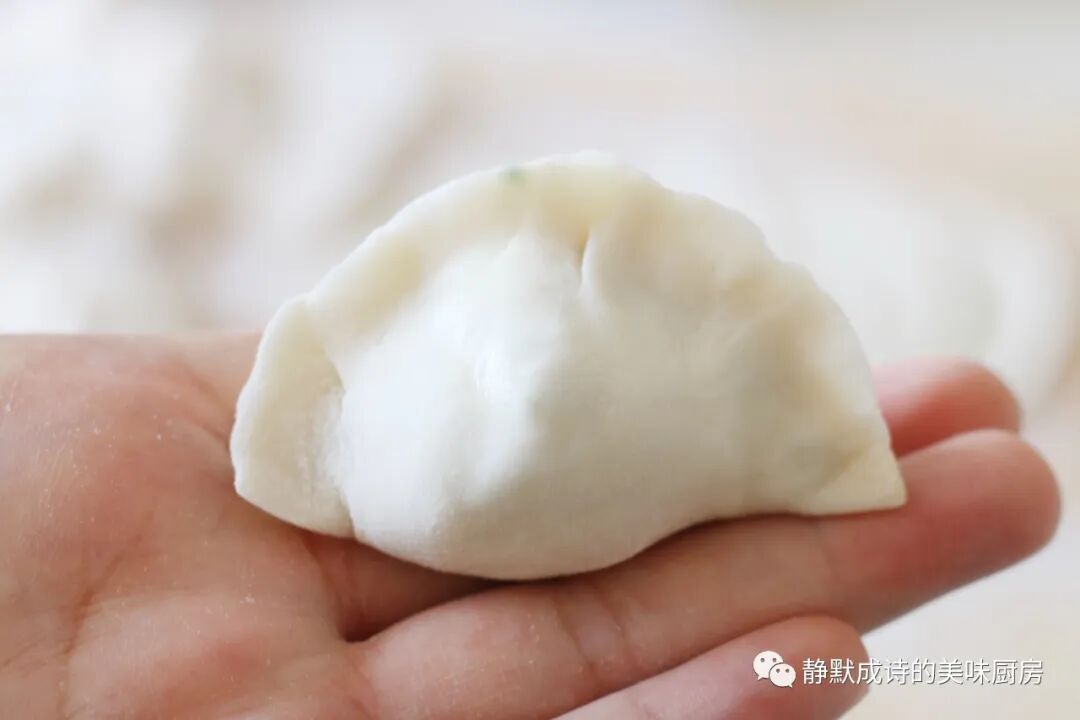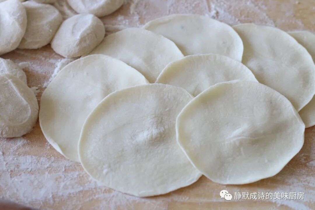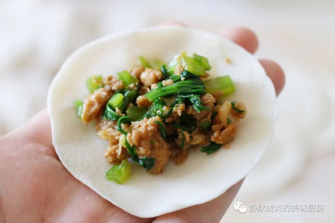 9、用一把勺子给饺子皮儿填馅儿,不要用筷子,因为过于松散无法夹住。