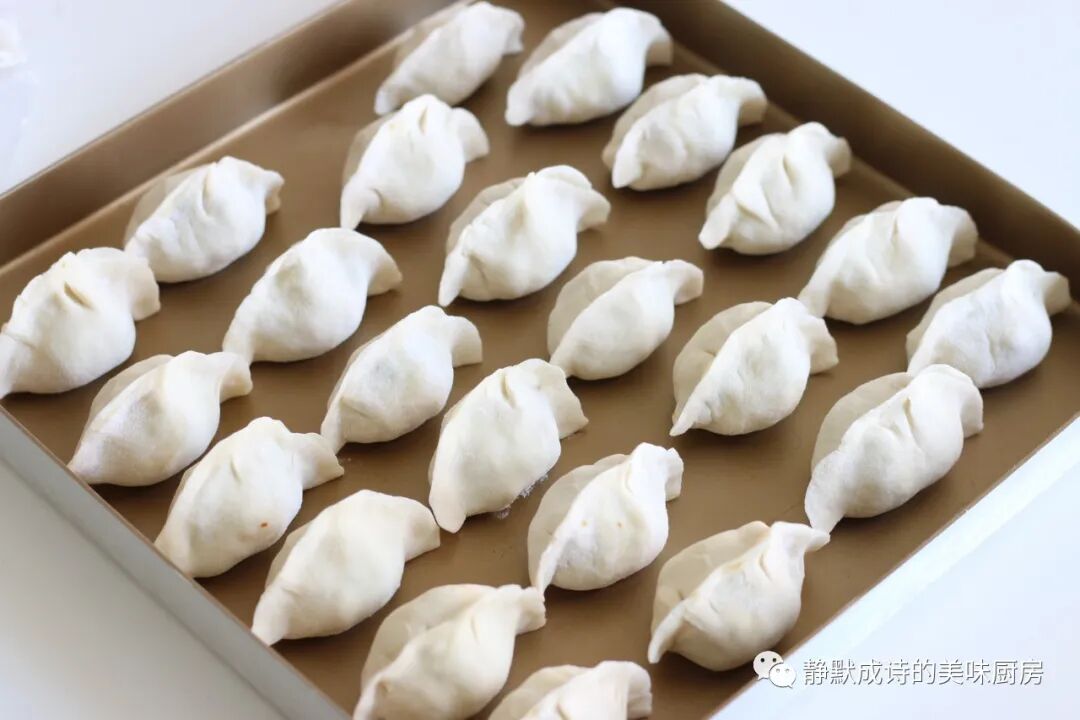 11、我包得多,把饺子放进托盘,然后放冰柜冷冻至定型,定型后即刻放进食品袋,冷冻保存。