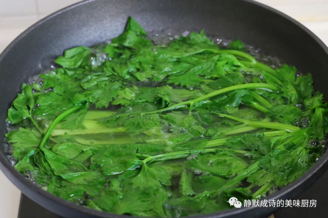 4、把芹菜洗净,烧半锅清水,水开后把芹菜放进去焯烫。先放芹菜茎部分再放叶,这样芹菜叶就不会过软。对了,芹菜的嫩叶不要丢掉,它比芹菜茎还富有营养。
