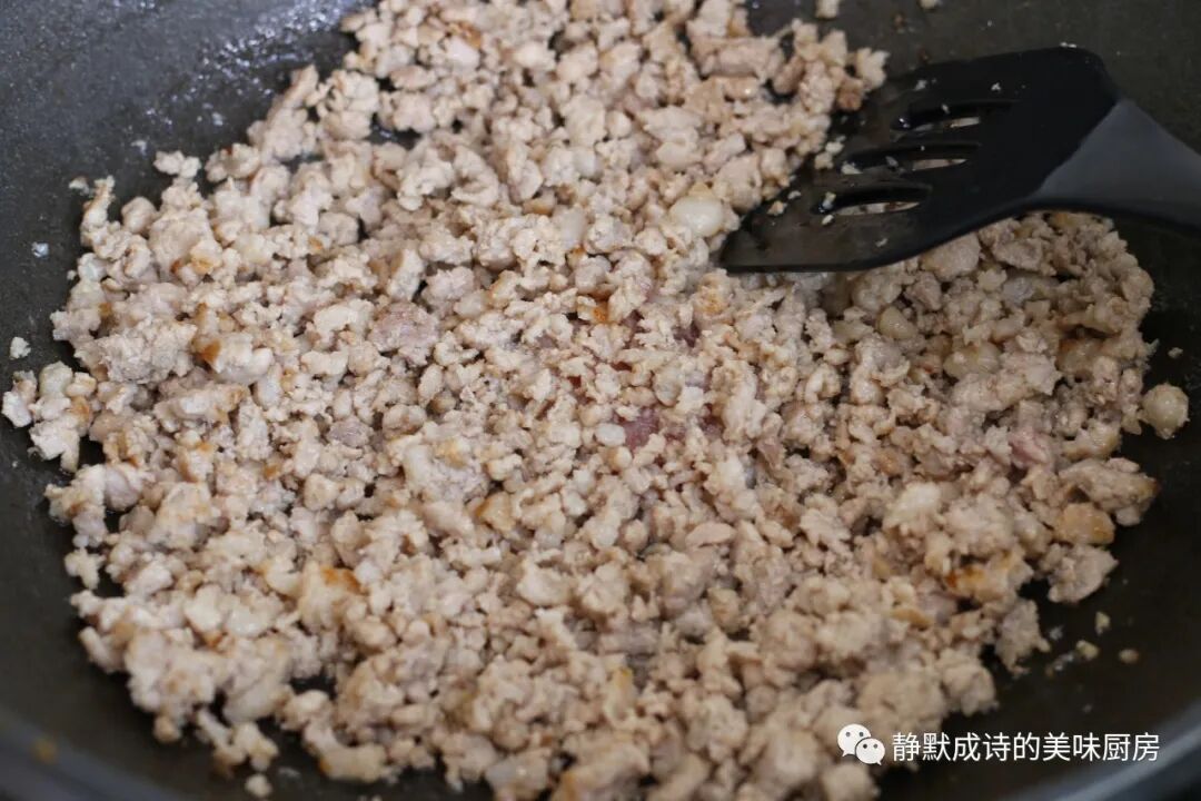 2、热锅热油,加入猪肉末,小火煸炒至变色和松散。