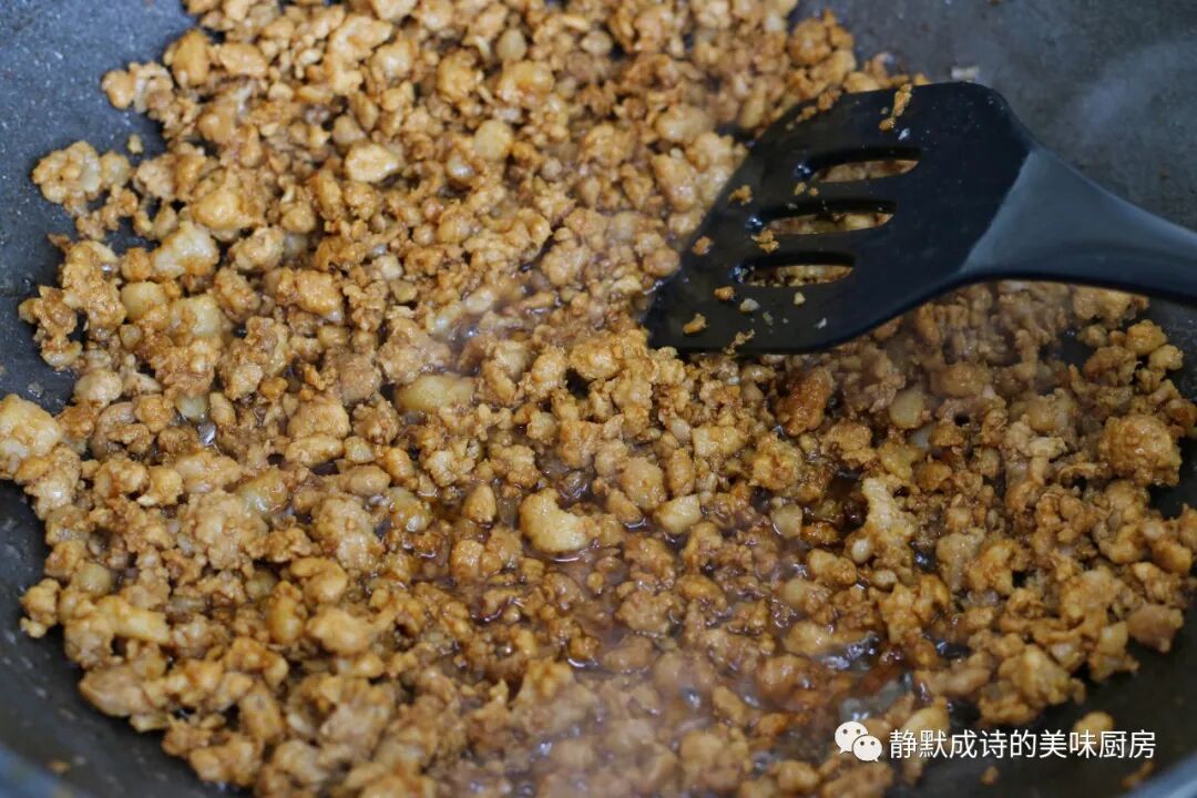 3、然后加入生抽、老抽和适量盐,翻炒均匀至肉末上色,关火晾凉待用。