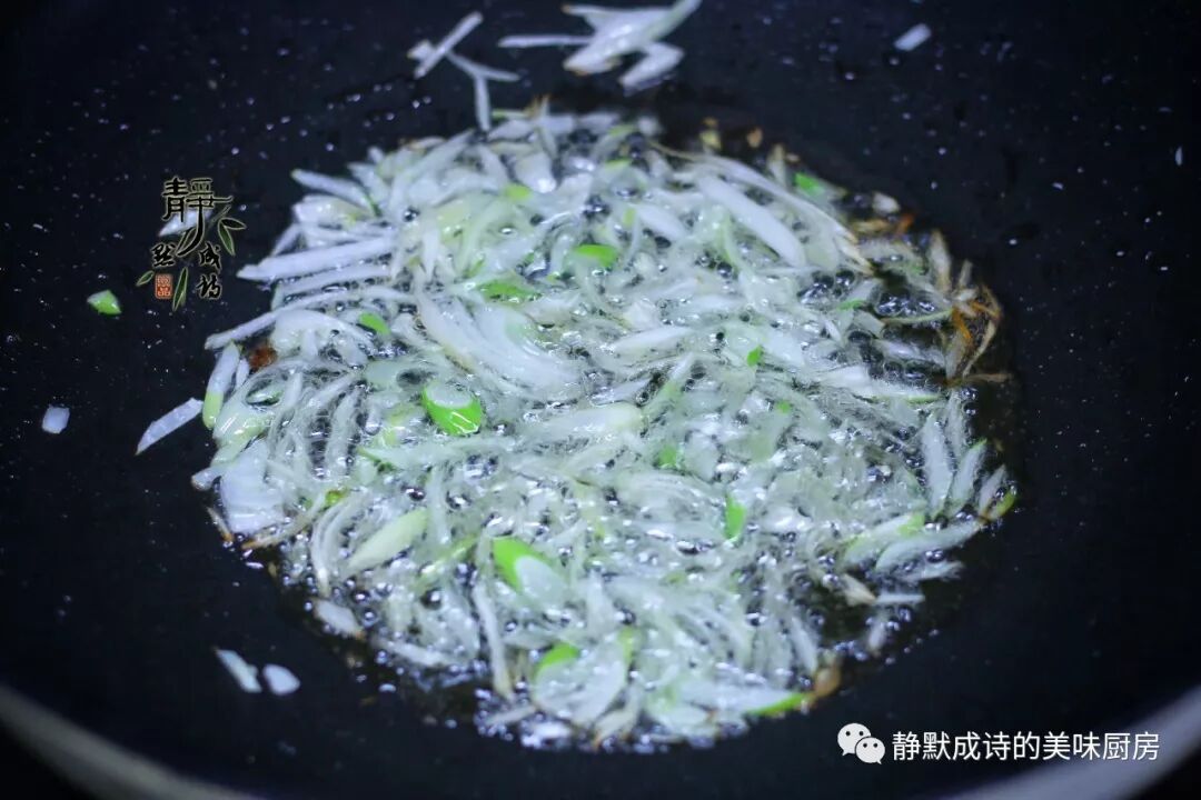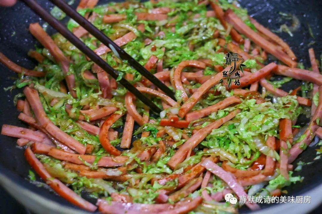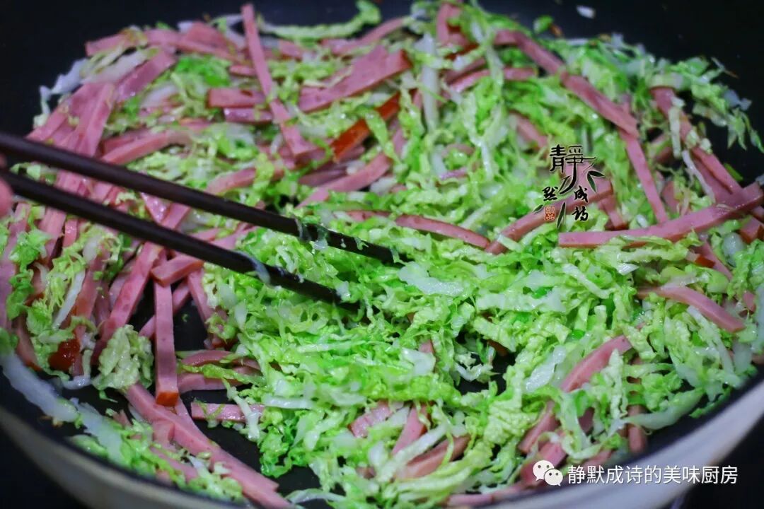 4、热锅热油,炝香葱花,然后倒入切好的火腿丝和蔬菜丝,用筷子快速翻炒。