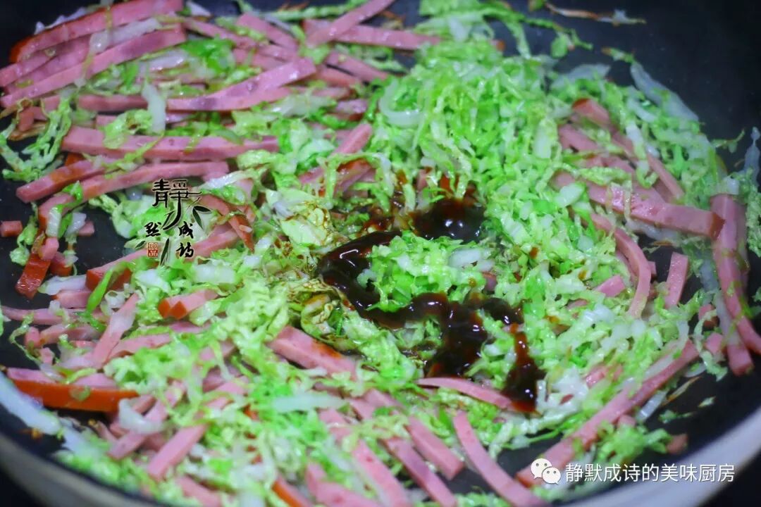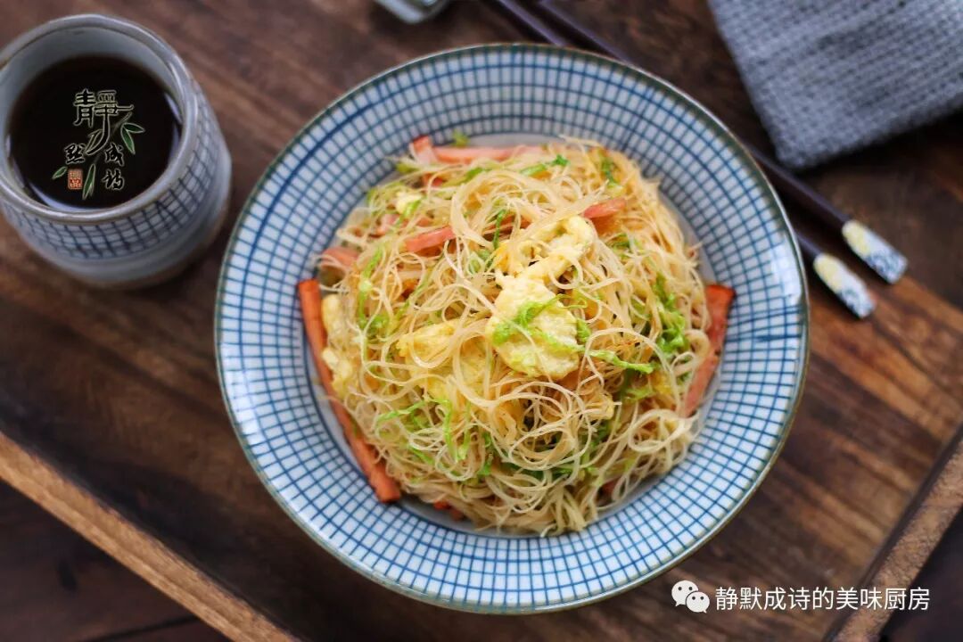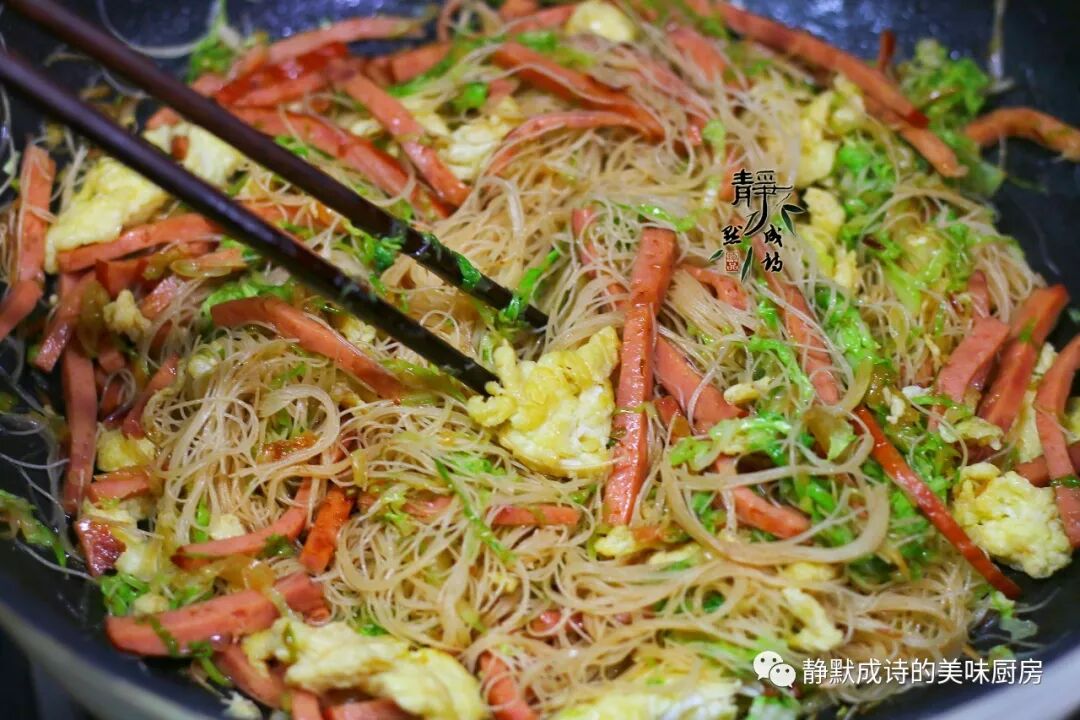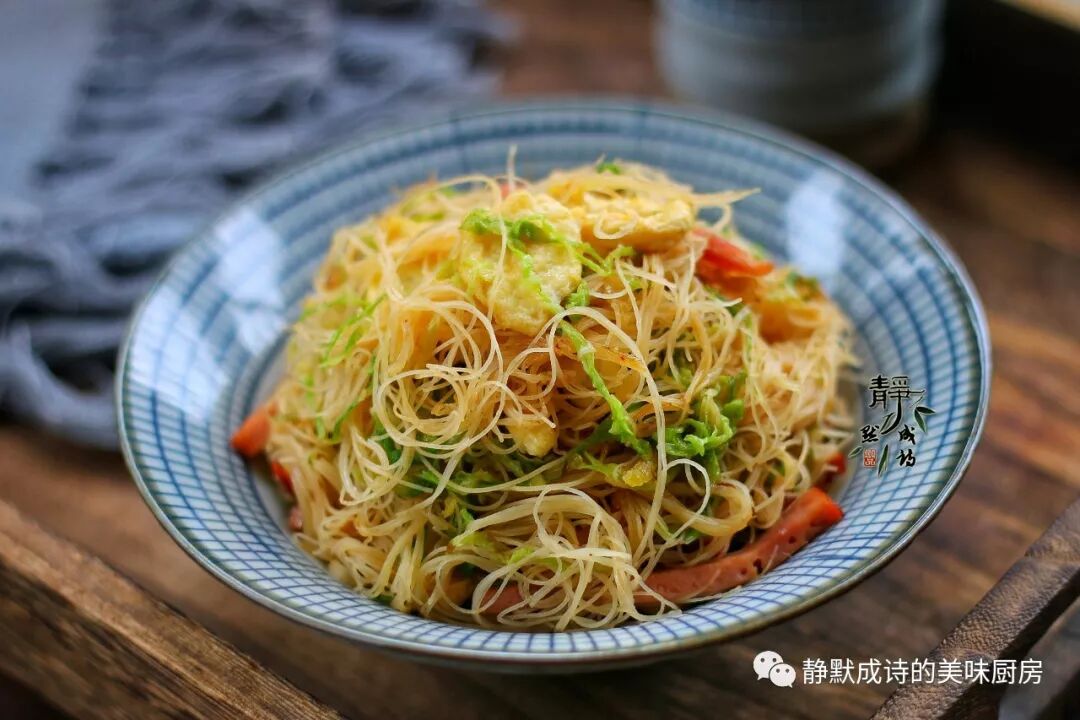 【食材】:米粉(干)250克、包菜半个或白菜叶适量、火腿150克、鸡蛋两个、葱花5克、蚝油1汤匙、酱油1汤匙、油盐适量。