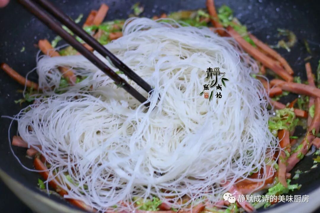 2、整个炒的过程非常快,米粉本来就是熟的,所以,只要把配菜炒香之后倒入米粉炒匀即可,七八分钟都用不上。