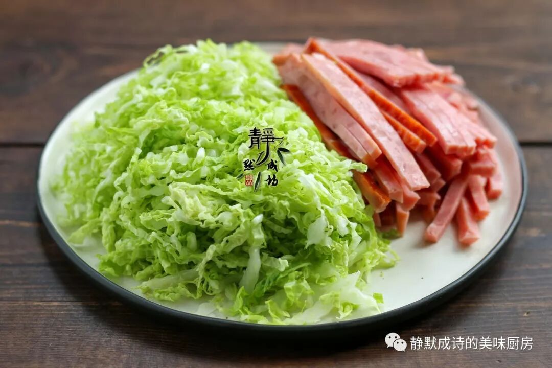 2、配菜提前切好:火腿与蔬菜均要切成细丝,与米粉尽量保持一致。如若再加点儿胡萝卜,炒出来的色泽会更漂亮。