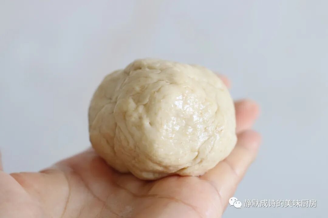7、然后让面团静置松弛10分钟左右,10分钟的时间足以让它半发酵。这个时间,手上抹点油,揪下一小块儿面团,整理成球状。
