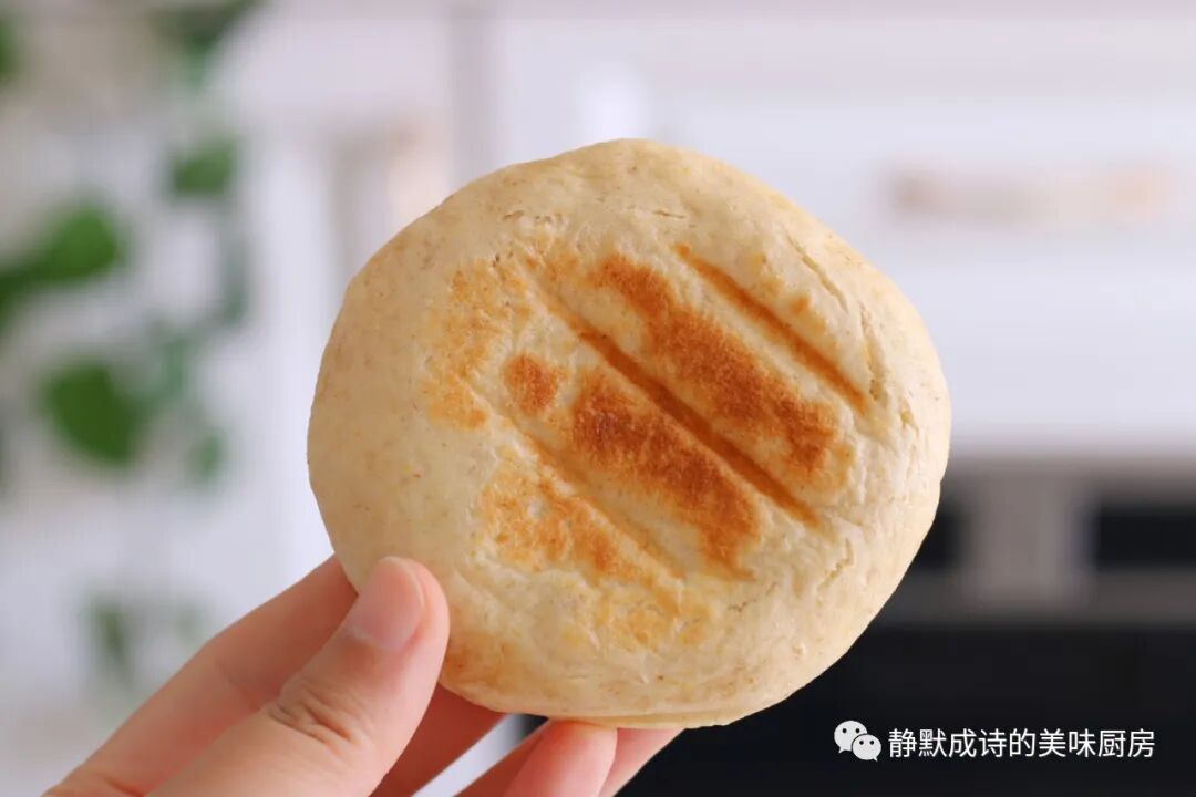 这款饼做法简单,因为不用擀面杖,所以面团需要软,和面时要多加点水。面团整形时会粘手,没关系,抹一点点油就行了,而且在烙饼过程中不用刷油,所以,饼吃起来是丝毫不油的,外皮很干爽,拿在手里也不会粘到油。