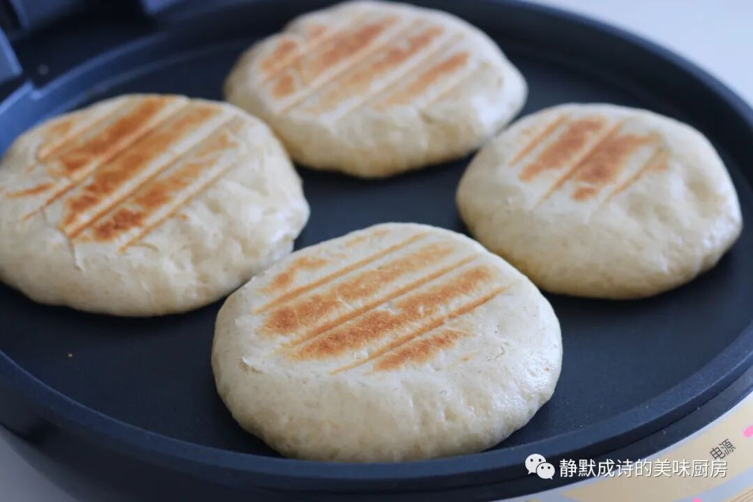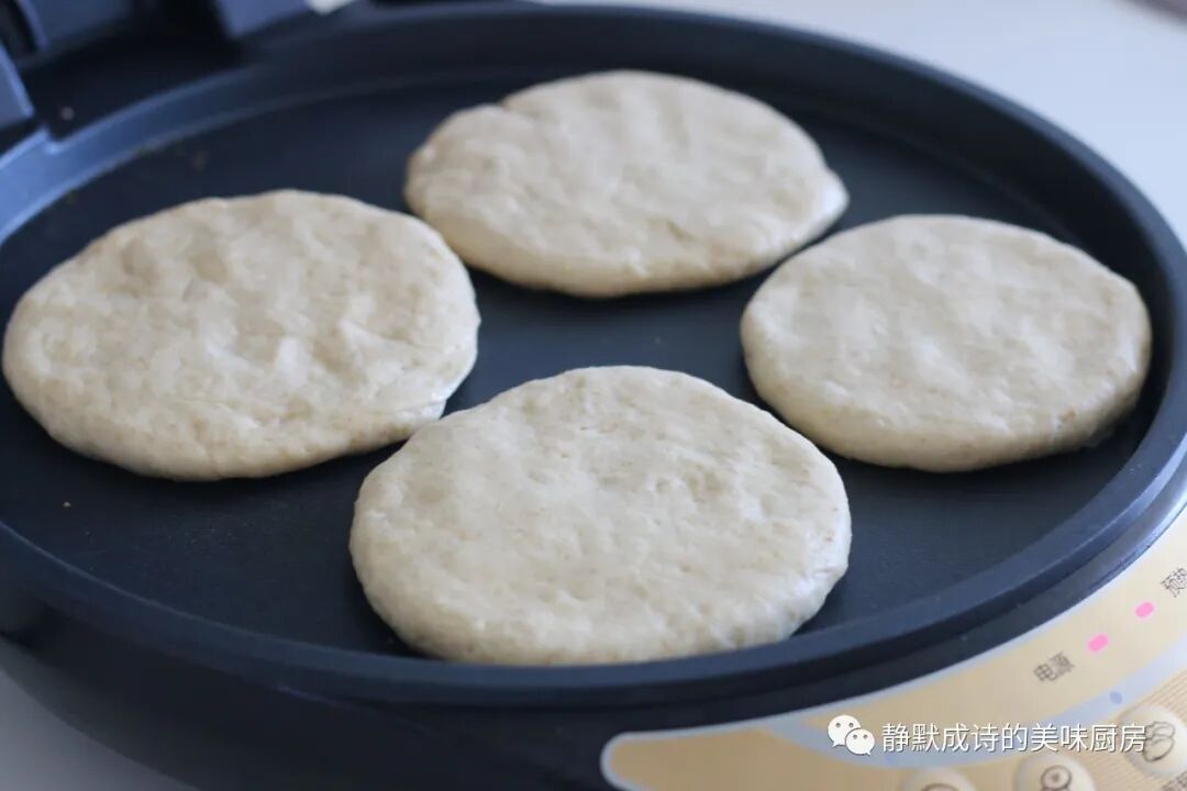 8、再放进电饼铛,按扁平,要保留一定厚度。