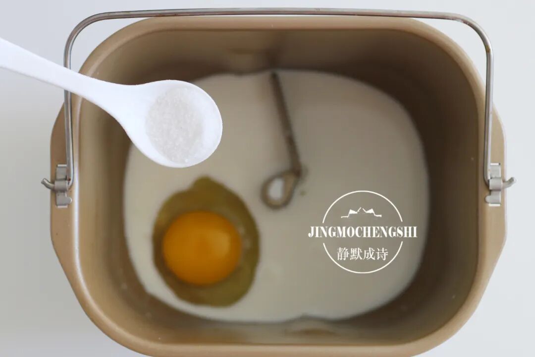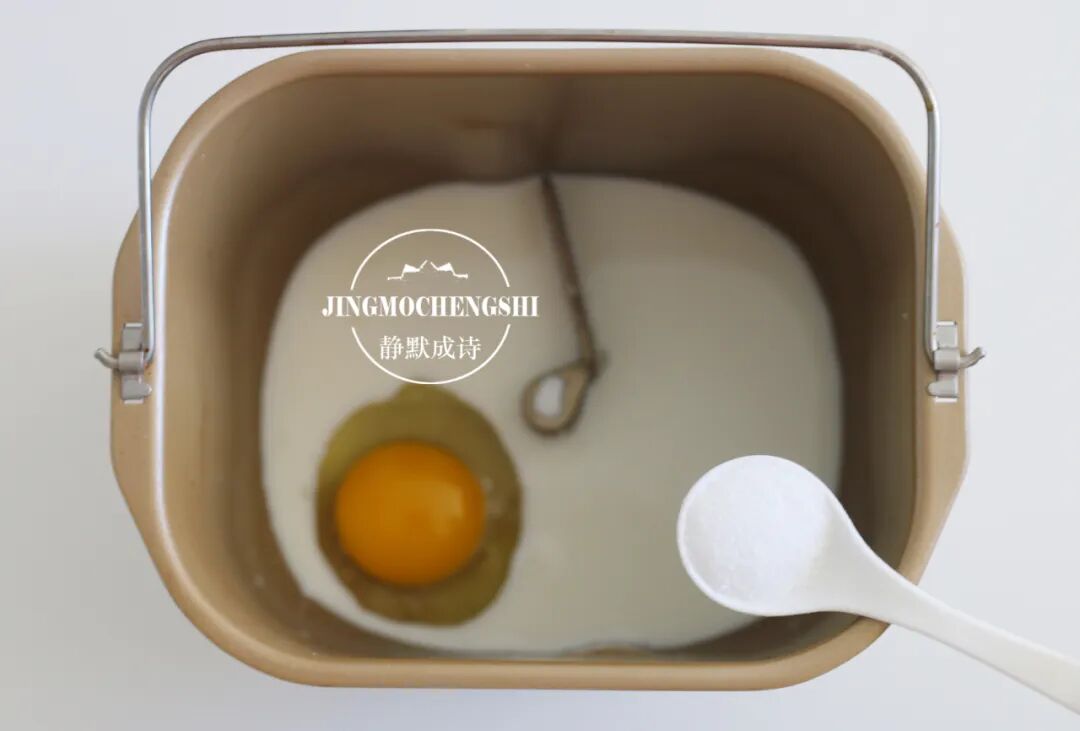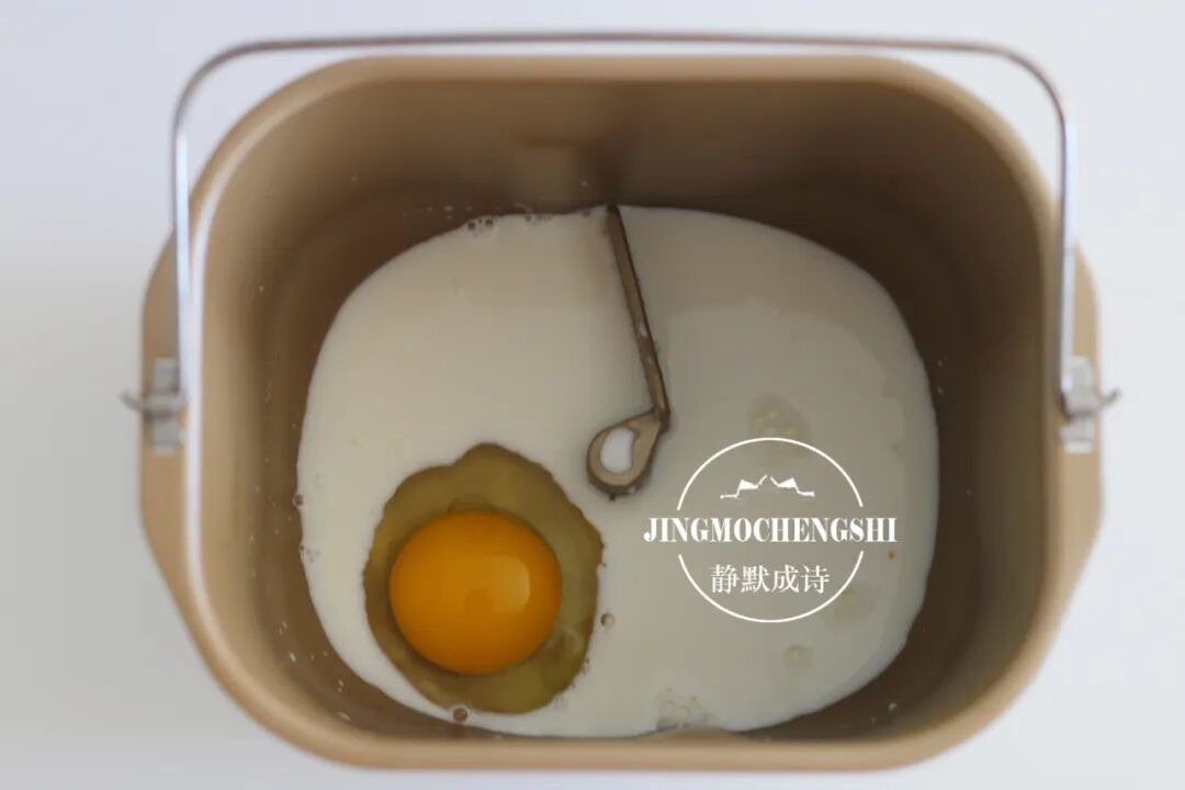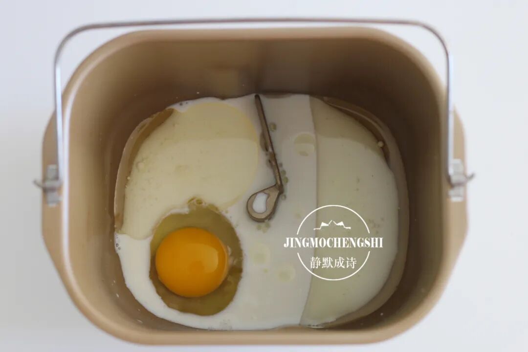 3、把牛奶和鸡蛋放进面包机桶。先放液体后放固体,这是原则。