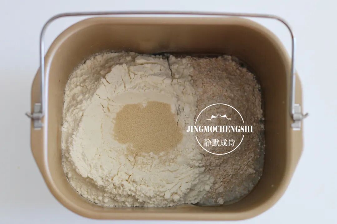 7、再把面粉类放进去,尽量覆盖住液体。然后在面粉中间挖个小坑,把酵母放进去。酵母不要接触到液体。