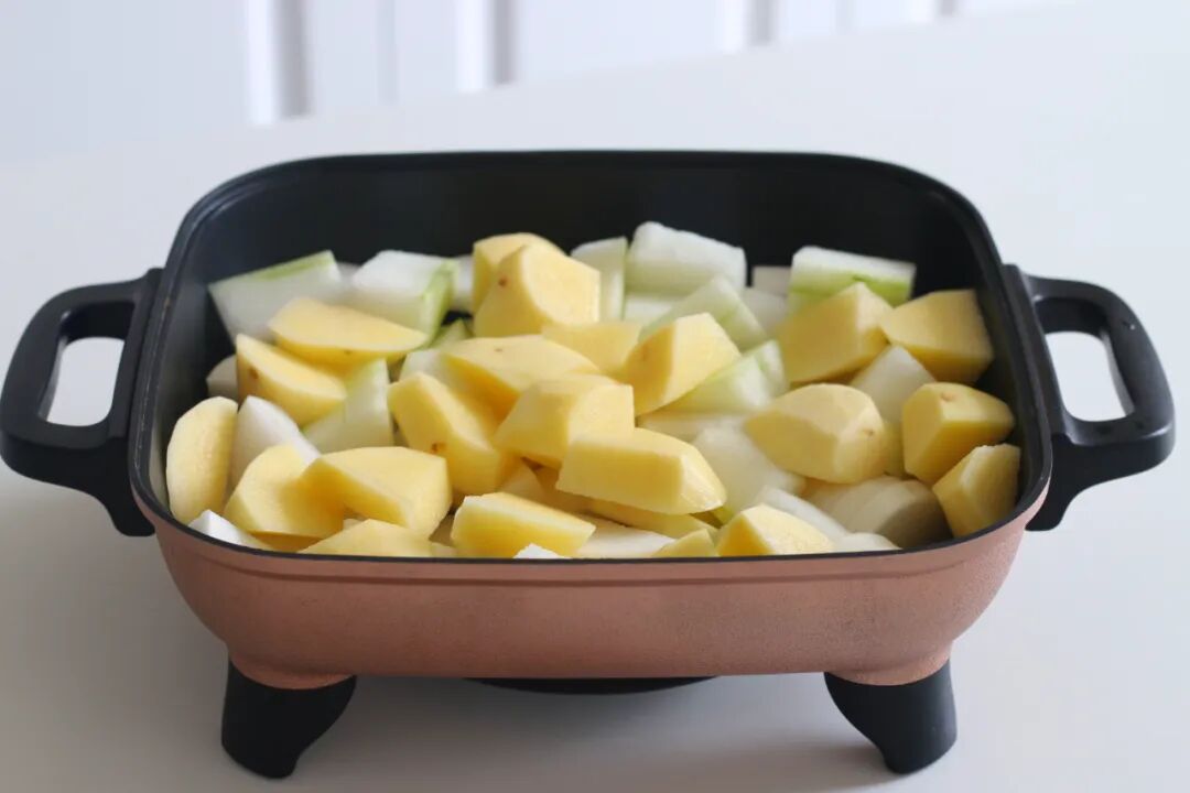 3、锅底蔬菜是老三样:冬瓜、土豆和白萝卜,都洗净改刀铺在火锅底部。这里需要注意的是这三样蔬菜都要切成大块儿,耐煮不易烂。