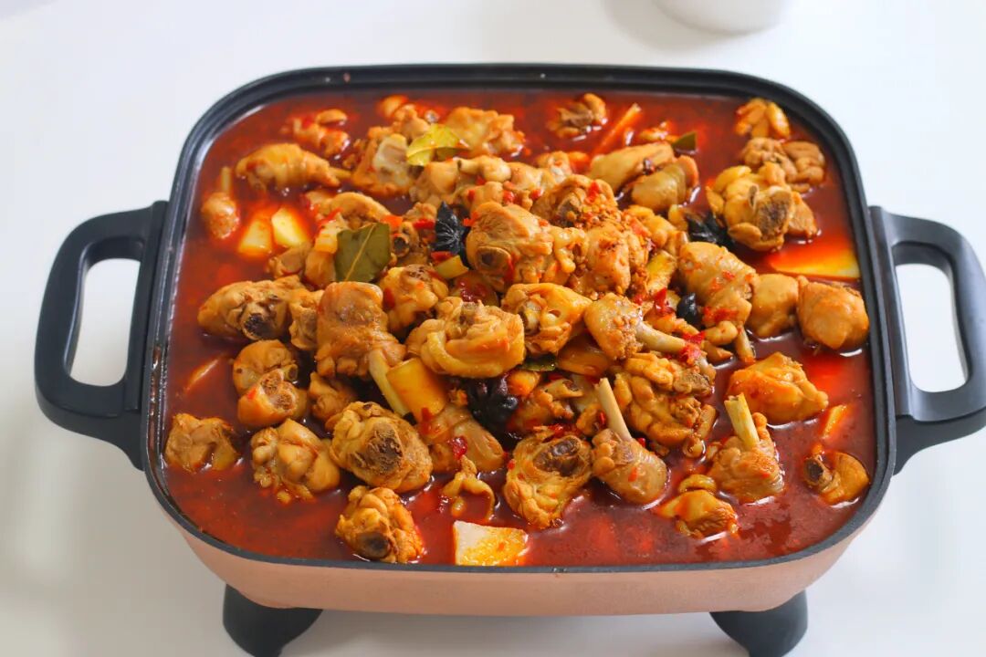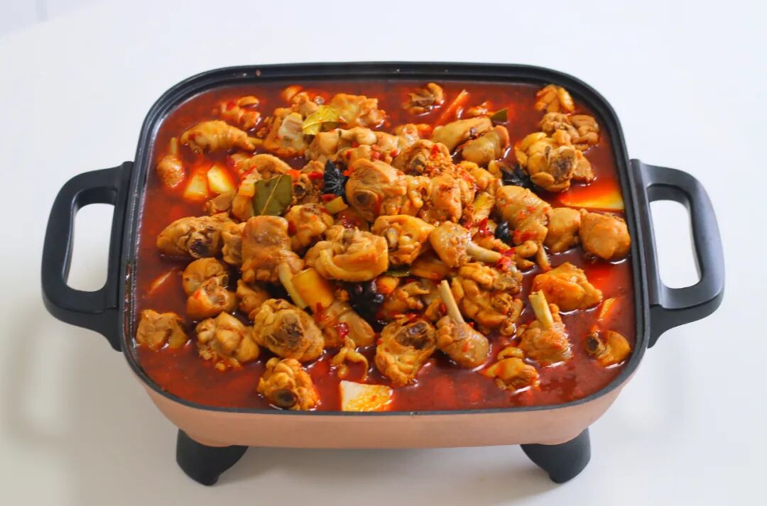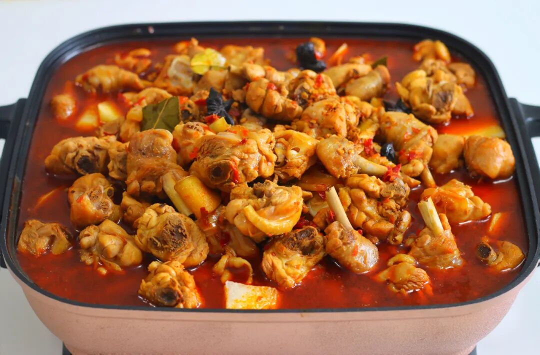 7、把鸡肉捞进电火锅中,再把汤也倒进来,此时,电火锅就可以端上餐桌了。这一锅,看着就食欲满满,让人胃口大开。若是家里谁食欲不佳,你就做这一锅给ta,保准胃口大开!