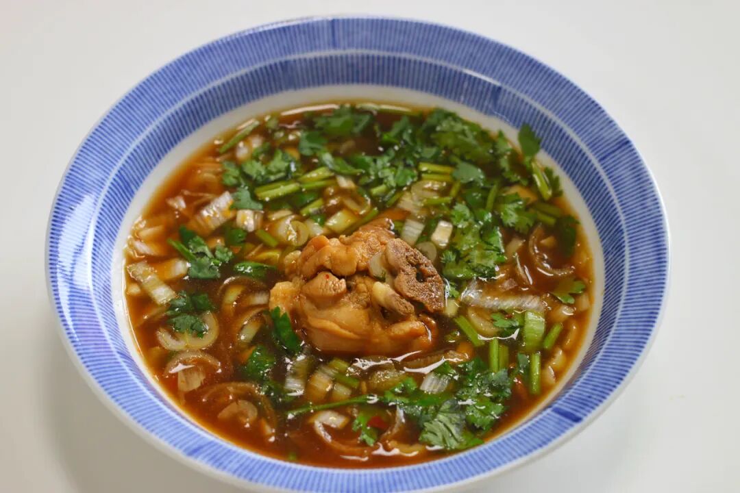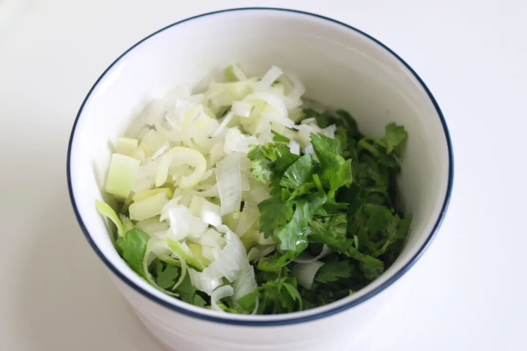8、把葱末和香菜末放进自己用的小碗里,添加两勺火锅原汤,就可以当料碗了,我们当地都这么吃,味道很好。