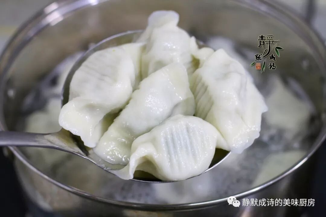 9、煮开半锅清水,水开后下饺子,接着用漏勺沿锅边轻轻搅动防止粘底,盖上锅盖煮开,水开后加半碗清水进去,再盖上锅盖煮开,如此反复两三次,待饺子的肚子圆滚滚就可以捞出来了。