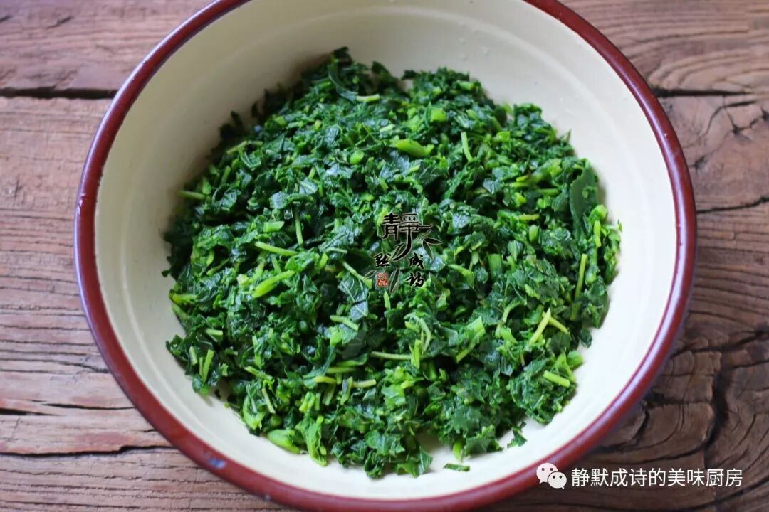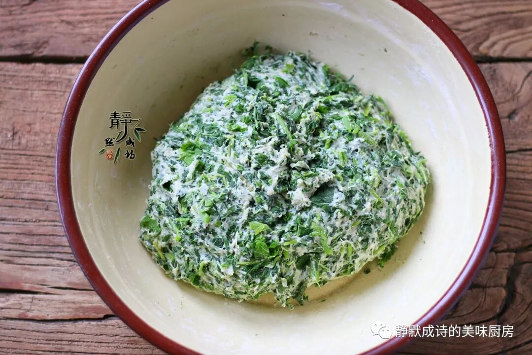 3、往切碎的苋菜中加入适量面粉,面粉不要加多,以能把苋菜团成团即可,不要试图一次加到位,边搅拌边加。注意这里是不加水的,因为苋菜经过焯烫后,水分很多,这些水分就足以搅成面团。如果焯烫后的苋菜不攥掉些水分的话,这里要加很多面粉,不建议,因为这个饼以菜为主,面粉为辅。