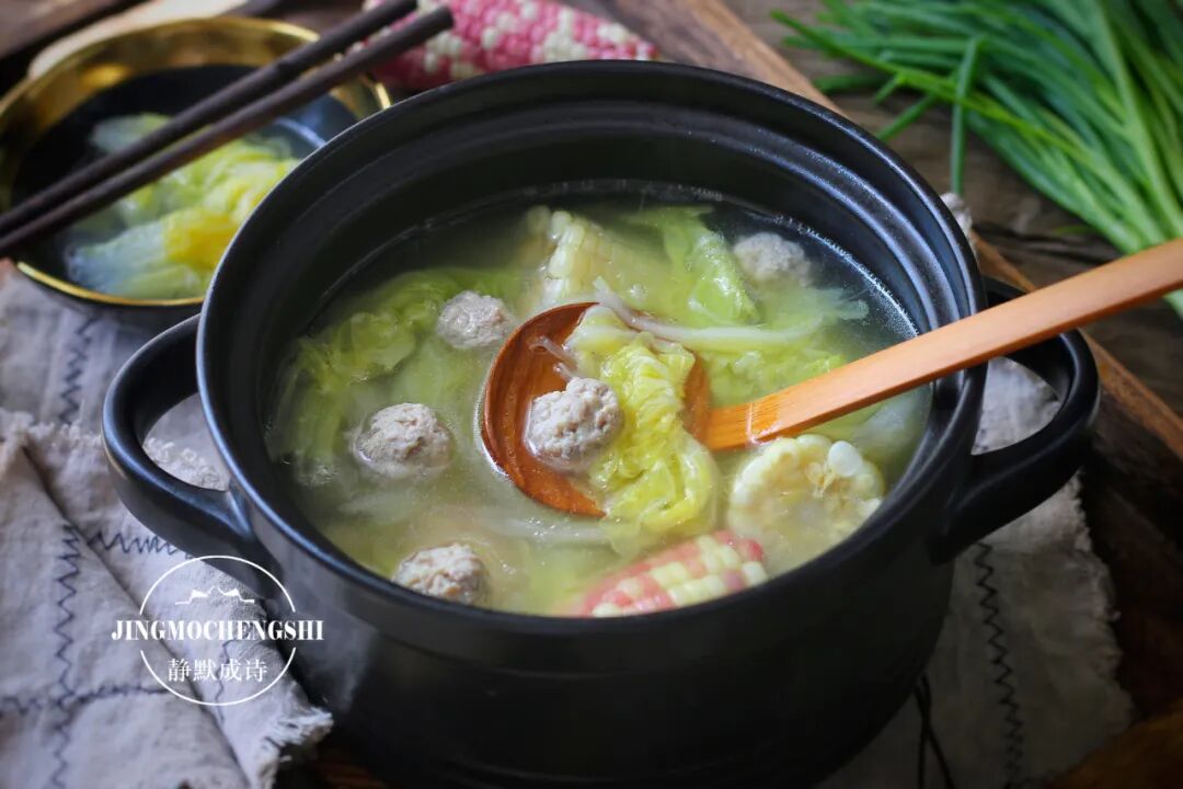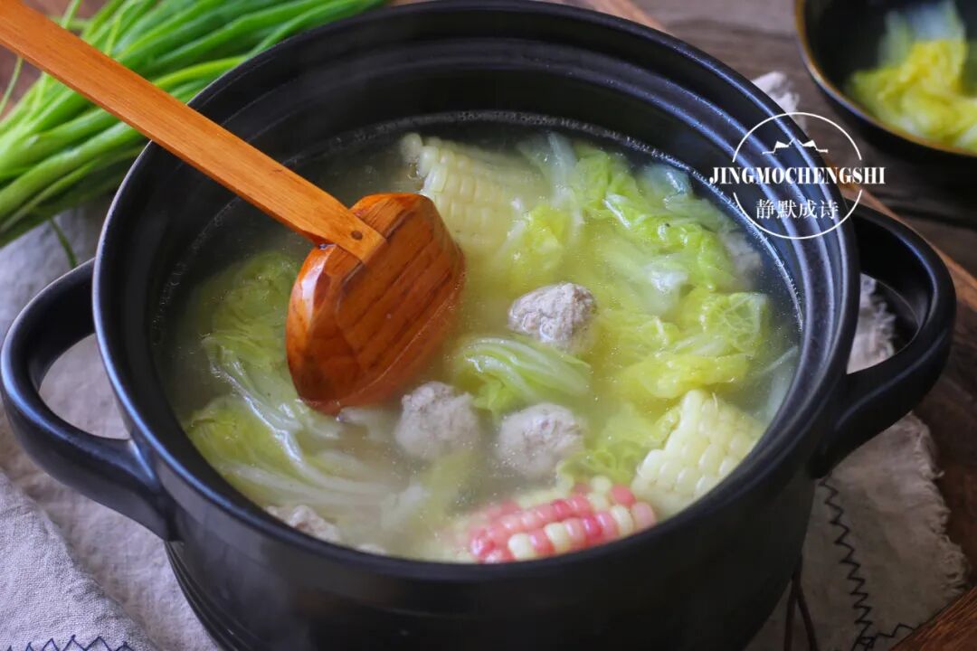我总是一次性做三四斤猪肉的肉丸,能吃很久。所以,整个夏天,我家都有好喝又有营养的各式蔬菜丸子汤。今天又给老公孩子煮了玉米白菜肉丸汤,汤非常地清甜,吃完肉丸白菜再啃玉米,孩子对这款汤尤其满意,每次煮,她都是连喝两碗才过瘾。