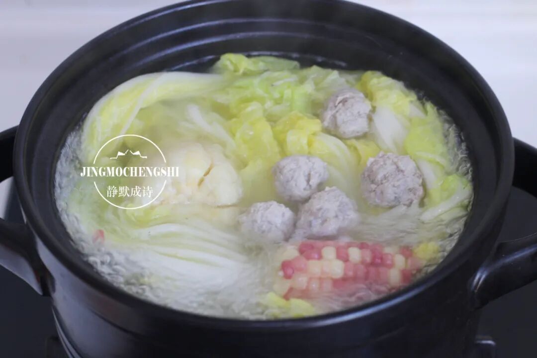 2、肉丸和很多蔬菜都很搭,冬瓜、白菜、玉米、海带、土豆之类的都可以,看个人喜好。把肉丸和蔬菜丢进锅中,只加盐调味儿即可,清淡不失营养,这种懒人汤很适合夏天食用。
