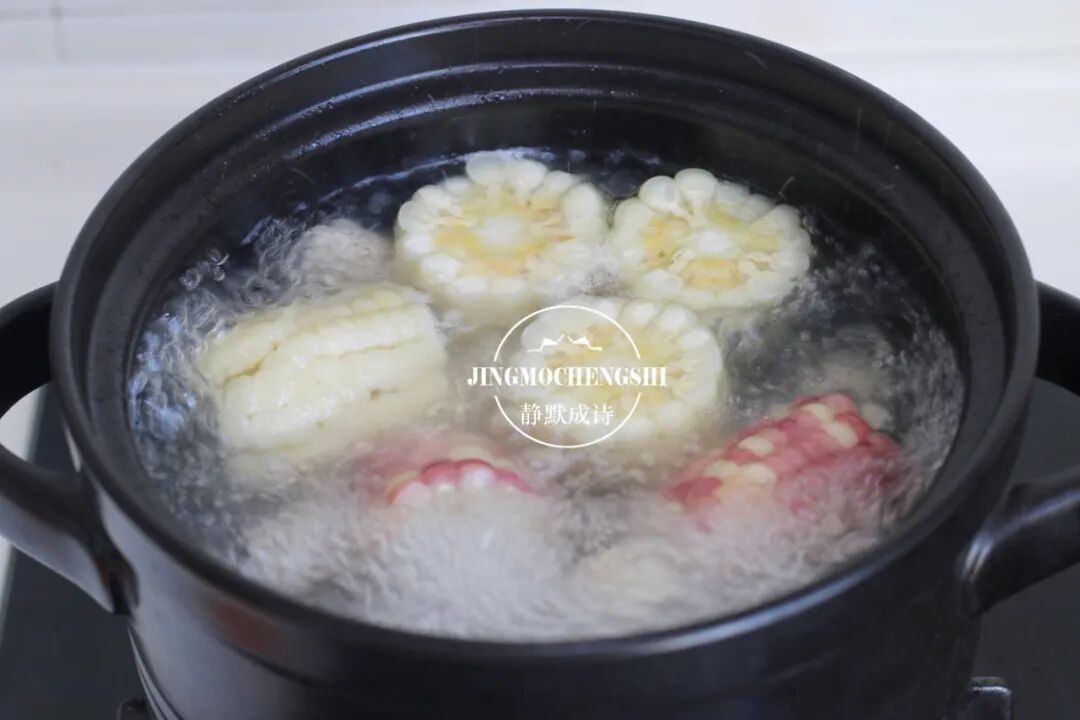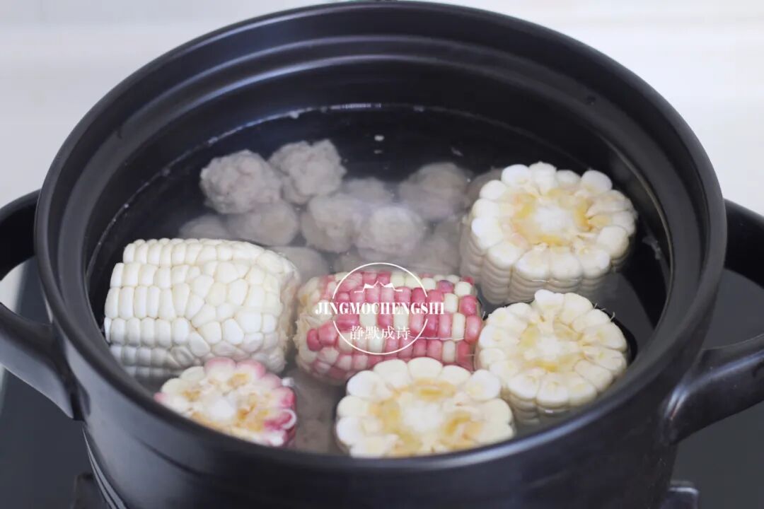 4、取汤煲,添加足量纯净水,把肉丸和玉米段同时放进去,开火,中小火煮开。
