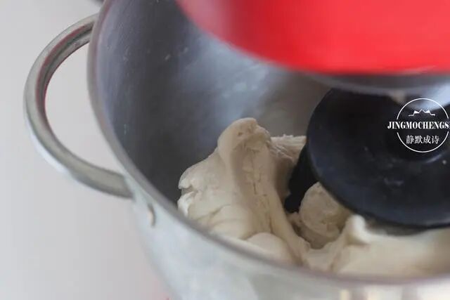 1、酵母用温水化开,倒进面粉中,和成较硬的面团。我直接用的厨师机和的面,解放双手。这个面团要硬,因为后面我们要加马齿苋碎进去,马齿苋中水分不少,若是这里面团和的软硬到位,再加马齿苋的话,面团就软到不能碰了。