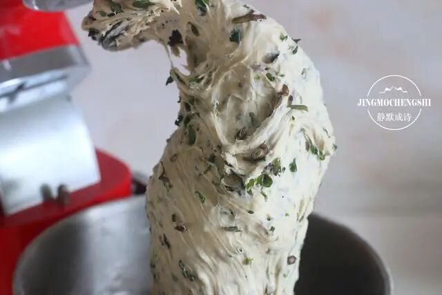 6、继续启动厨师机,把面团与马齿苋碎搅拌均匀。还是那句话,如果想省事儿,就把马齿苋碎腌制好之后加入到面粉中揉成蔬菜面团,揉好之后再发酵,发酵完成之后再加小苏打水揉匀即可。