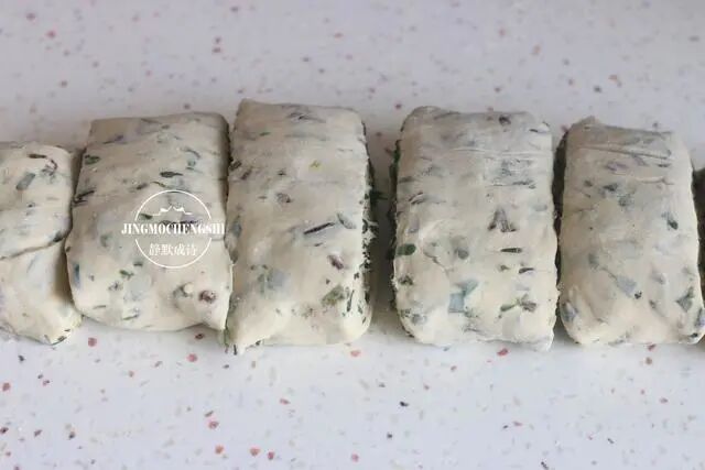7、待面团与野菜碎完全揉匀,把面团拿到操作台,分成大小一样的面剂子。