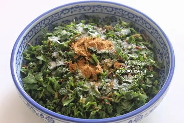 3、和好的面团放一边发酵。把马齿苋择洗干净,沥干水分,切碎,加入盐和十三香,搅拌均匀,腌制入味儿。