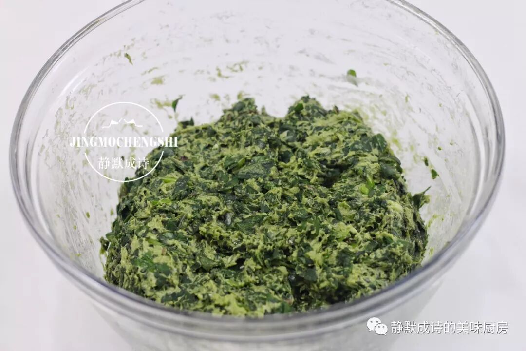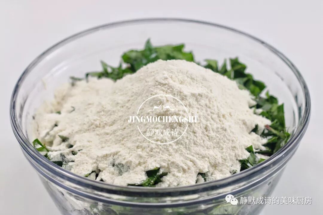 2、分次加入面粉。如前所述,红薯叶中含有大量的黏液蛋白,一会儿下手揉面时,会把它的黏液揉出来,与面粉结合。