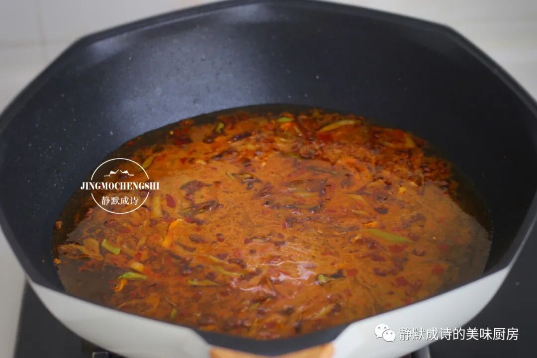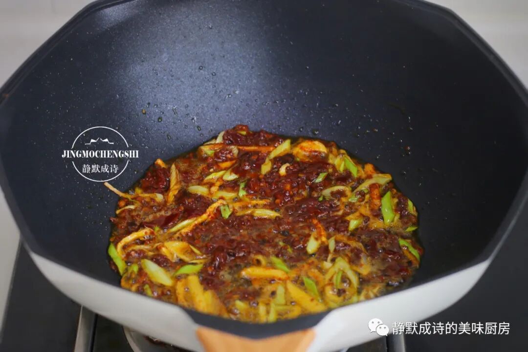 4、然后再加入郫县豆瓣酱,继续小火翻炒出红油。这里同样不能用大火,道理同花椒。
