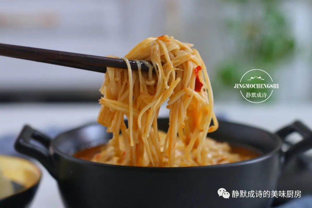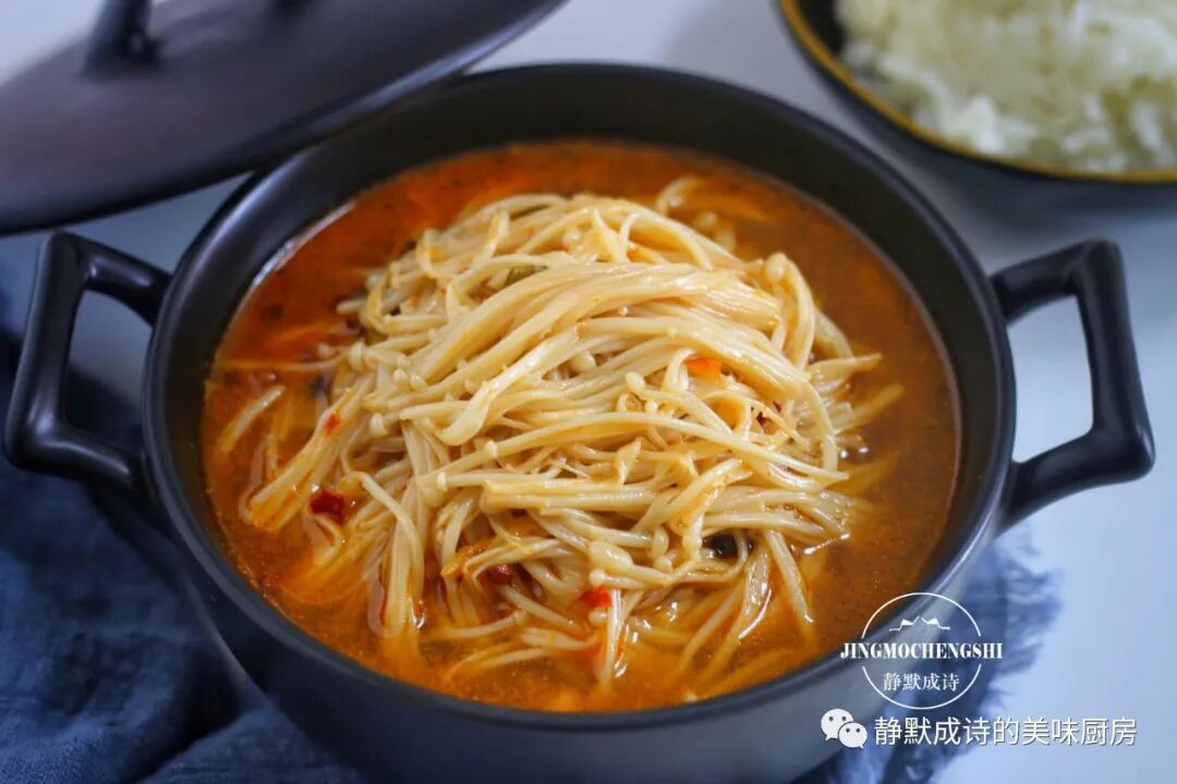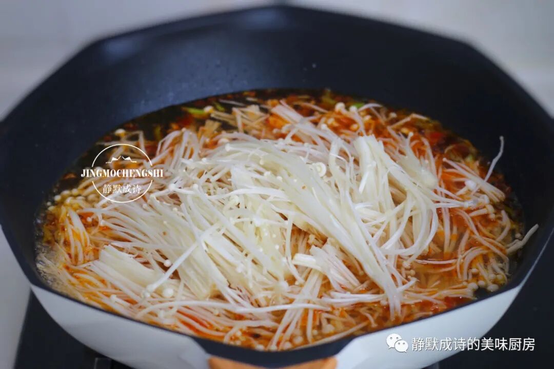 吃习惯了水煮肉水煮鱼,可以换换口味,来道全素的水煮菜,没肉没荤腥,照样好吃,下饭又解馋。而且这个季节,不得不提到金针菇,冬天不但是萝卜白菜的主场,也是它的舞台。金针菇,这个火锅的涮材,水煮的配菜,其实也完全可以独当一面,以主材的面貌出现在餐桌上,同样可以光芒四射,成为餐桌上的主角。瞧,它来了。