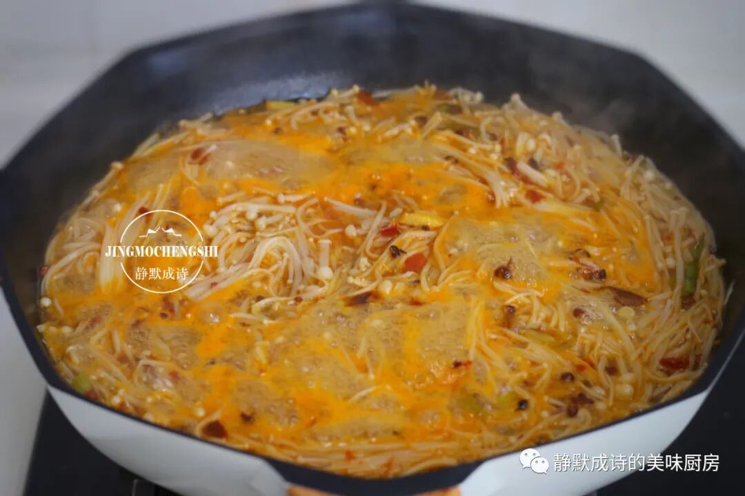 6、加入白糖,大火煮开之后继续煮两三分钟,再把金针菇全部放进去。
