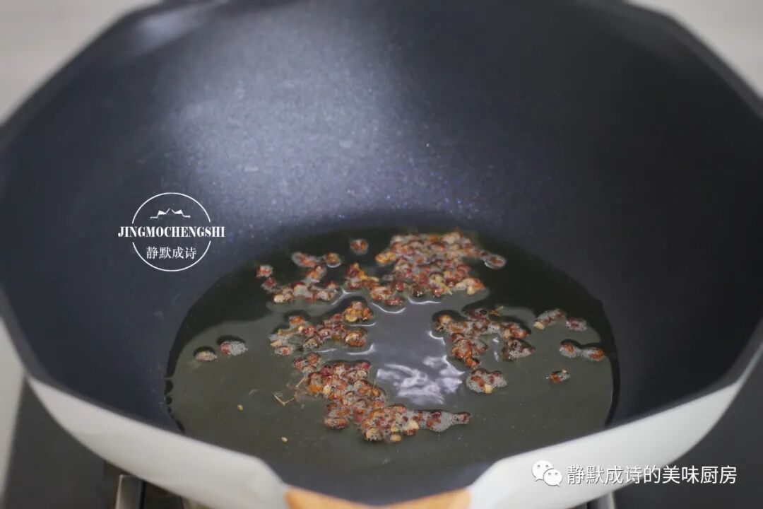 2、热锅冷油,花椒冷油下锅,小火炸出香味儿。花椒必须要冷油下锅并小火炸香,不然会迅速糊掉而且香味儿释放不出来。