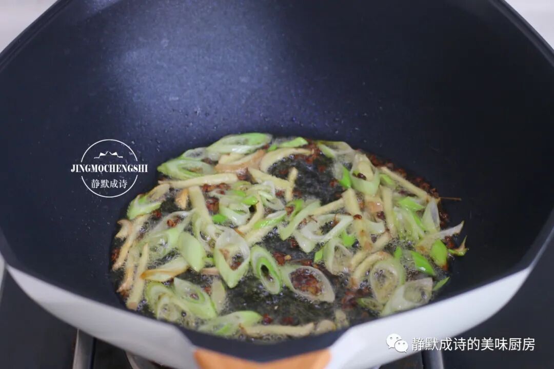 3、接着下葱花和姜丝,继续小火炒出香味儿。