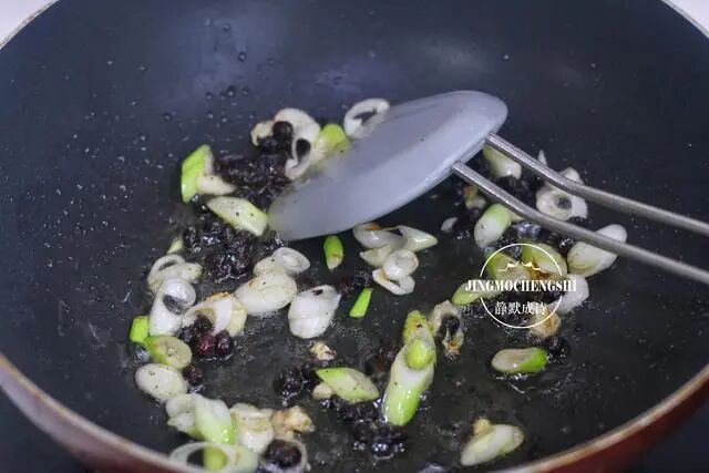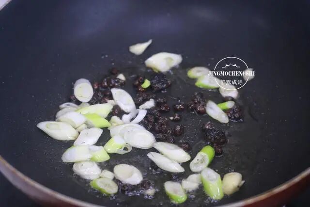 3、热锅热油,小火炒香豆豉,多翻炒几下,然后放入葱花和蒜末。