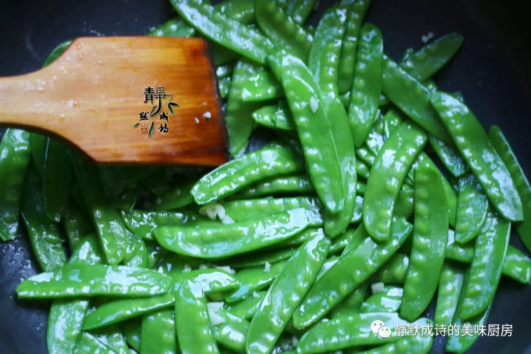 6、蒜香味儿炒出来之后,放入焯烫过的荷兰豆,调入少许盐,大火快速翻炒几下即可关火出锅。