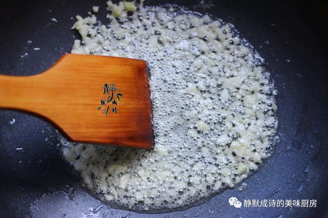 5、热锅热油,油热后转成小火,下蒜蓉,不停地翻炒,炒出蒜香味儿。这里火一定不能大,蒜蓉不要炒变色,不然会影响菜的品相。
