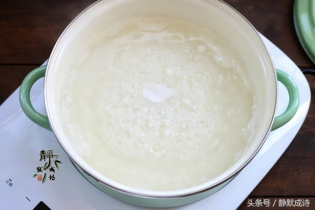 4、把米带水倒进煮锅,再添加适量清水,盖上锅盖大火煮开后转小火。米下锅至煮开的期间要搅动几次,防止米粘底。
