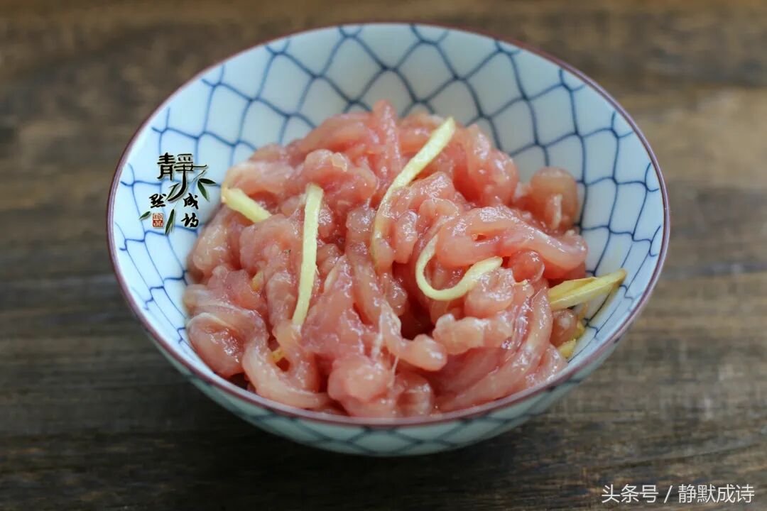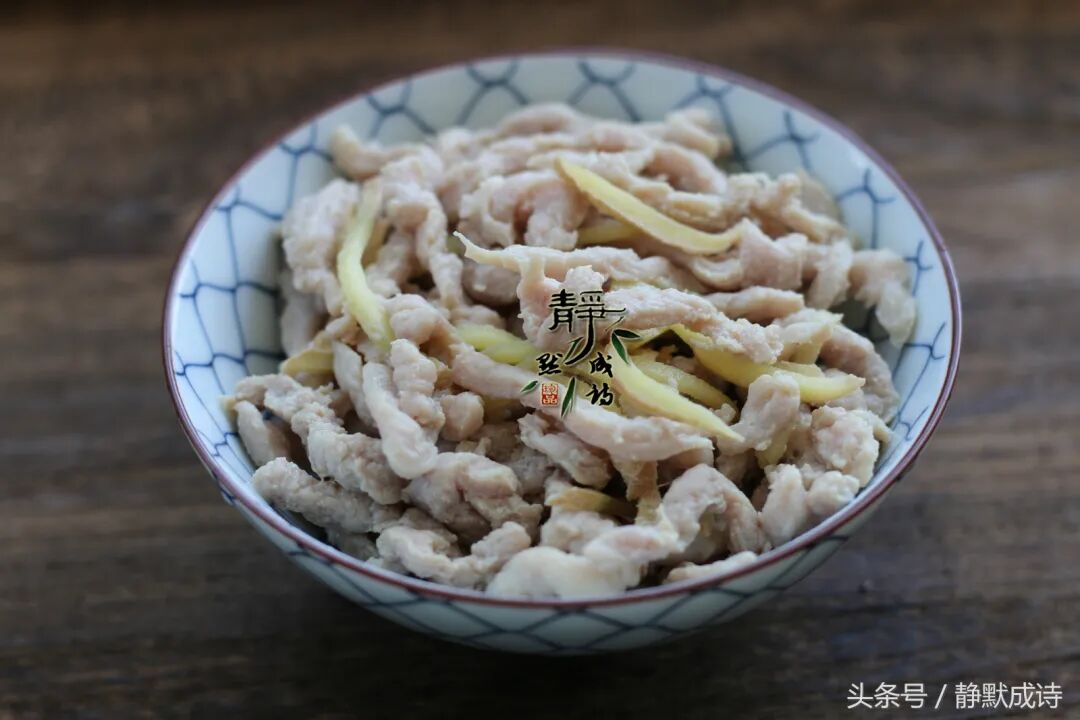 5、把腌制过的猪肉丝下开水中焯烫一下至变色捞出,用清水把肉丝上的浮沫冲洗干净待用。姜丝可以捡出来扔掉,也可以不捡。