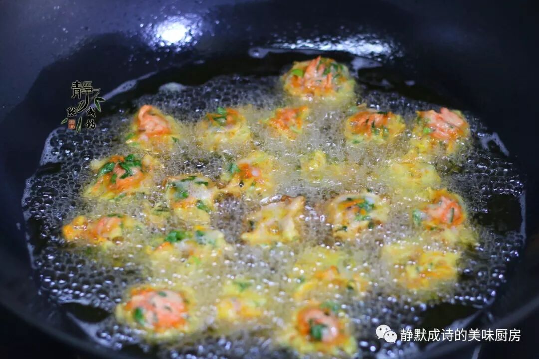 5、油烧热,拿一把吃饭用的小勺子,舀起一小勺胡萝卜面糊,下到油锅里,如此反复操作。