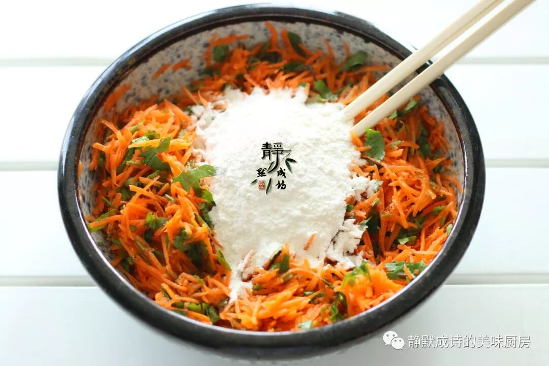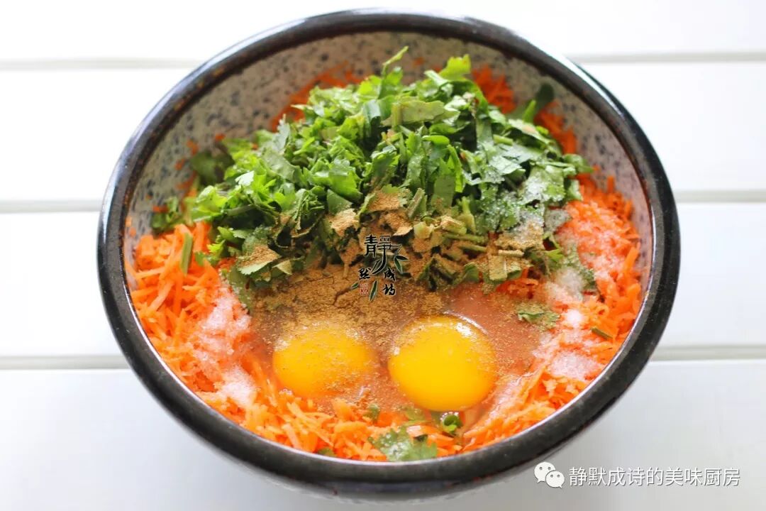 【食材】:胡萝卜6根、鸡蛋两枚、香菜1把、大葱1棵、五香粉1汤匙、面粉适量、盐适量、油。