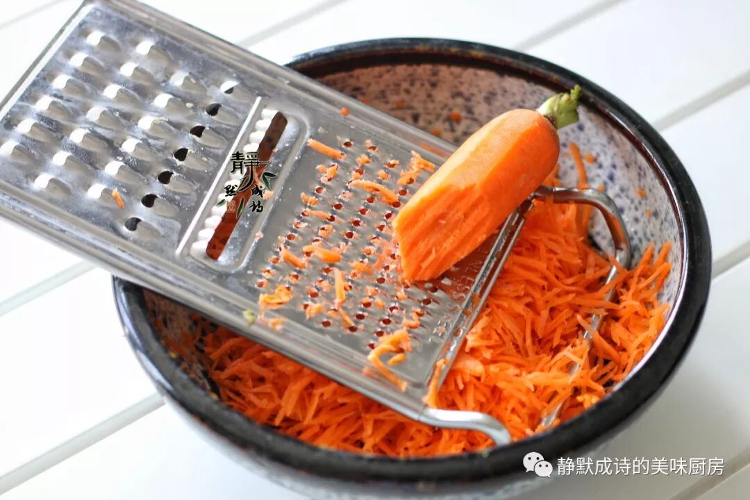 1、把胡萝卜洗净,用擦丝工具把胡萝卜擦成细丝。注意这里不要用擦丝特别长的那种工具,不然炸出来的丸子奇形怪状的,一点儿都不圆。