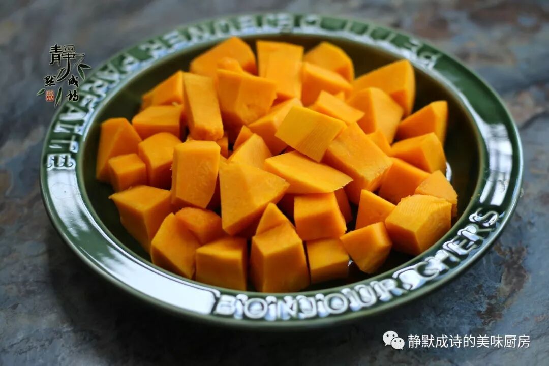 3、把南瓜切成大小一致的小块儿。南瓜质地比较硬,所以尽量切的小一些,容易熟。