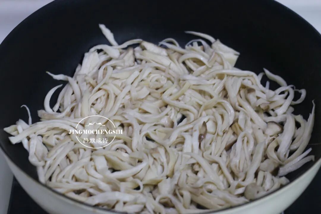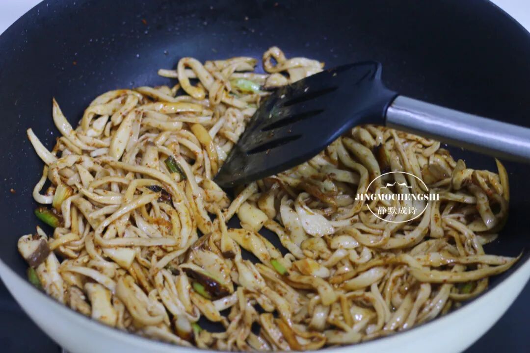 杏鲍菇第一次下锅时,锅中不要放油,干煸出水分盛出,这样炒出来的杏鲍菇有嚼劲儿,吃起来比不煸的要香很多。
