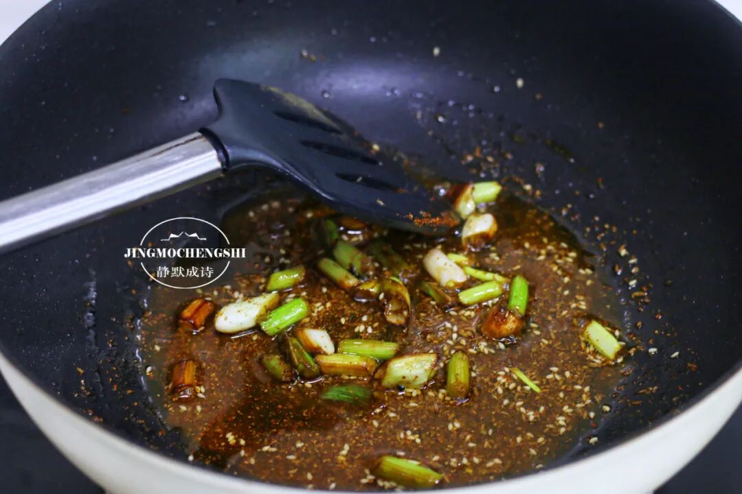 5、热锅热油,炝香葱花,然后放入孜然粉和辣椒粉,小火炒香。因为不是特别能吃辣但又爱微微的辣,我放的辣椒粉极少,所以看不出红油。