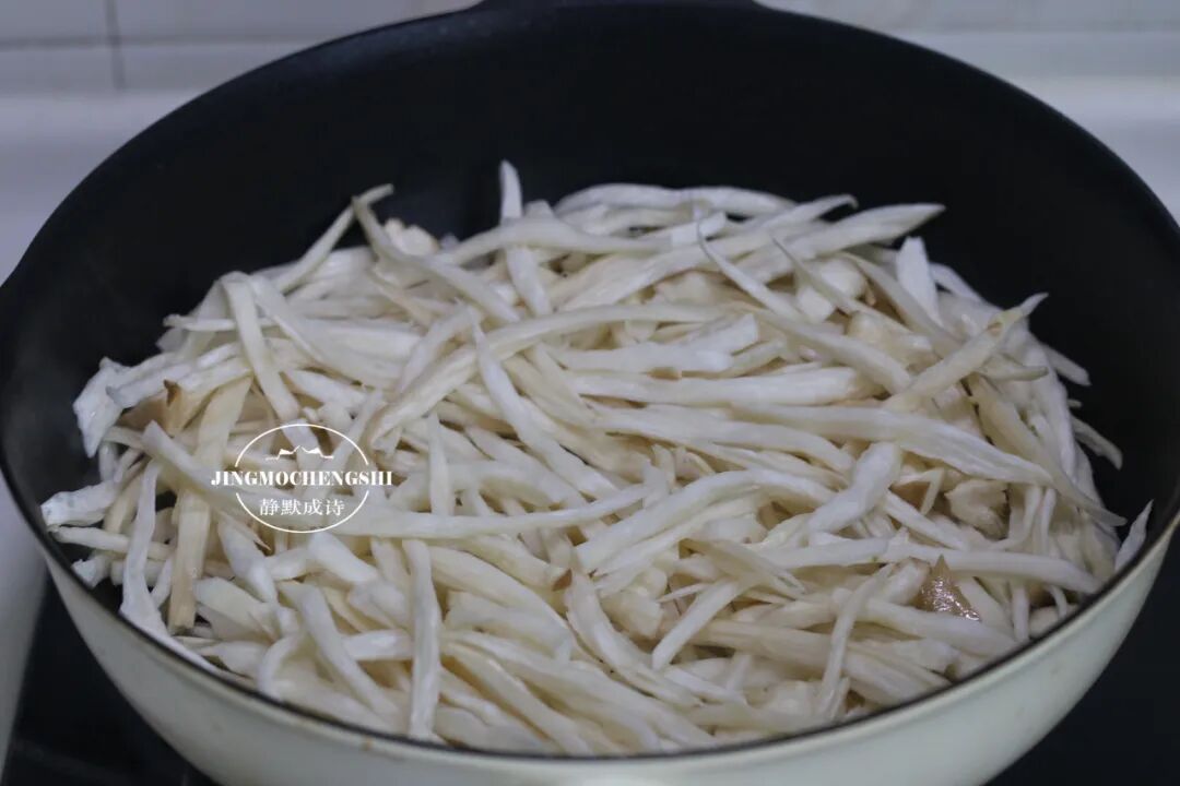 2、把炒锅烧热,不要放油,不要放油哦!把杏鲍菇条倒进锅中小火炒,无油炒的目的是把杏鲍菇中的水分炒出来,类似于干煸。