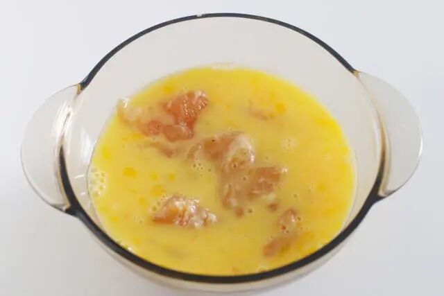 6、把两枚鸡蛋搅拌均匀,鸡肉在蛋液里打个滚,然后放进面包糠里再滚一滚,周身沾满一层面包糠。