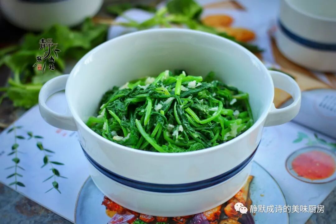 7、萝卜苗沥水,把蒜汁儿往上一浇,拌匀,即可开动了。白萝卜苗极为脆嫩,吃起来清口清爽又清香。