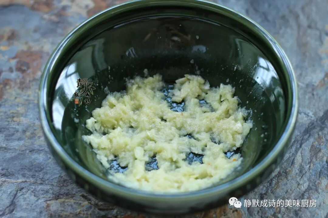 2、烧小半锅清水,在烧开水的过程中,也不要闲着,我们来准备蒜汁儿。萝卜苗与白菜苗一样,不服别的,只服蒜,蒜越多,这道凉拌菜就越是够味儿越是好吃,所以,蒜不要少放,半头以上。