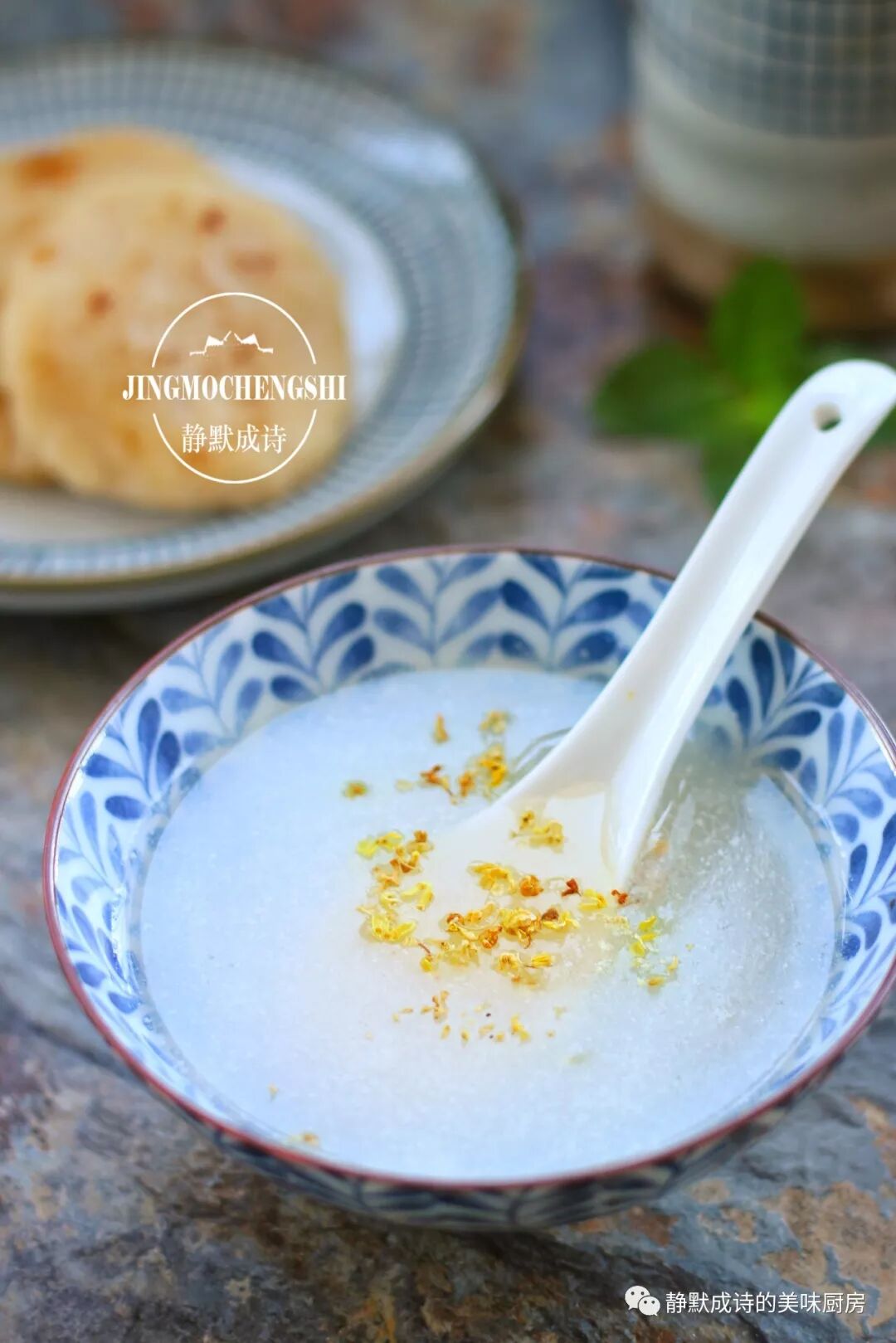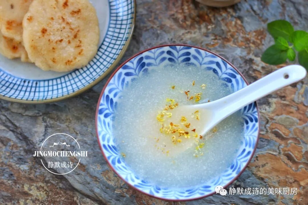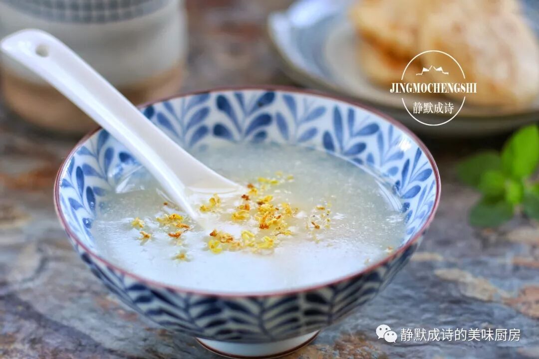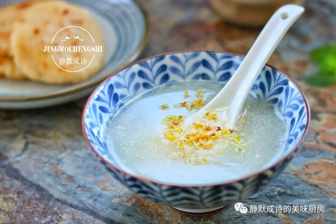 6、倒入碗中,再撒上些许沁人心脾的干桂花,一碗清香宜人的藕汁就大功告成了,入口微甘且无比滑爽,一碗不够就继续,让你在秋日里依旧水润动人。