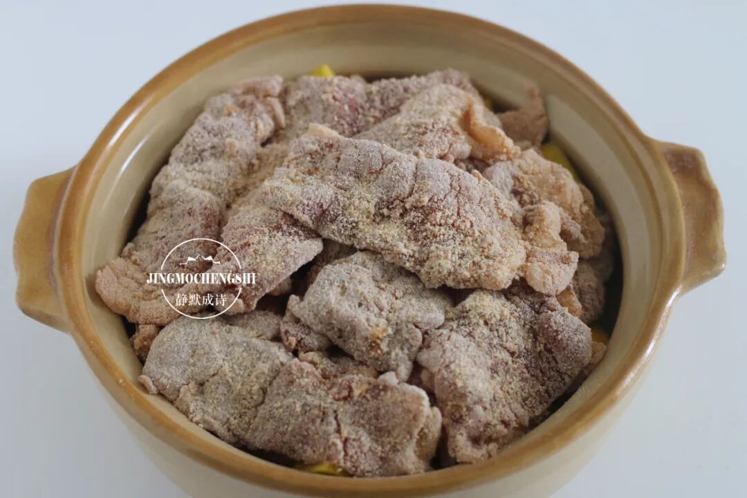 第15步:把裹过米粉的肉片码在南瓜上,覆盖过南瓜,就可以上锅蒸了。
